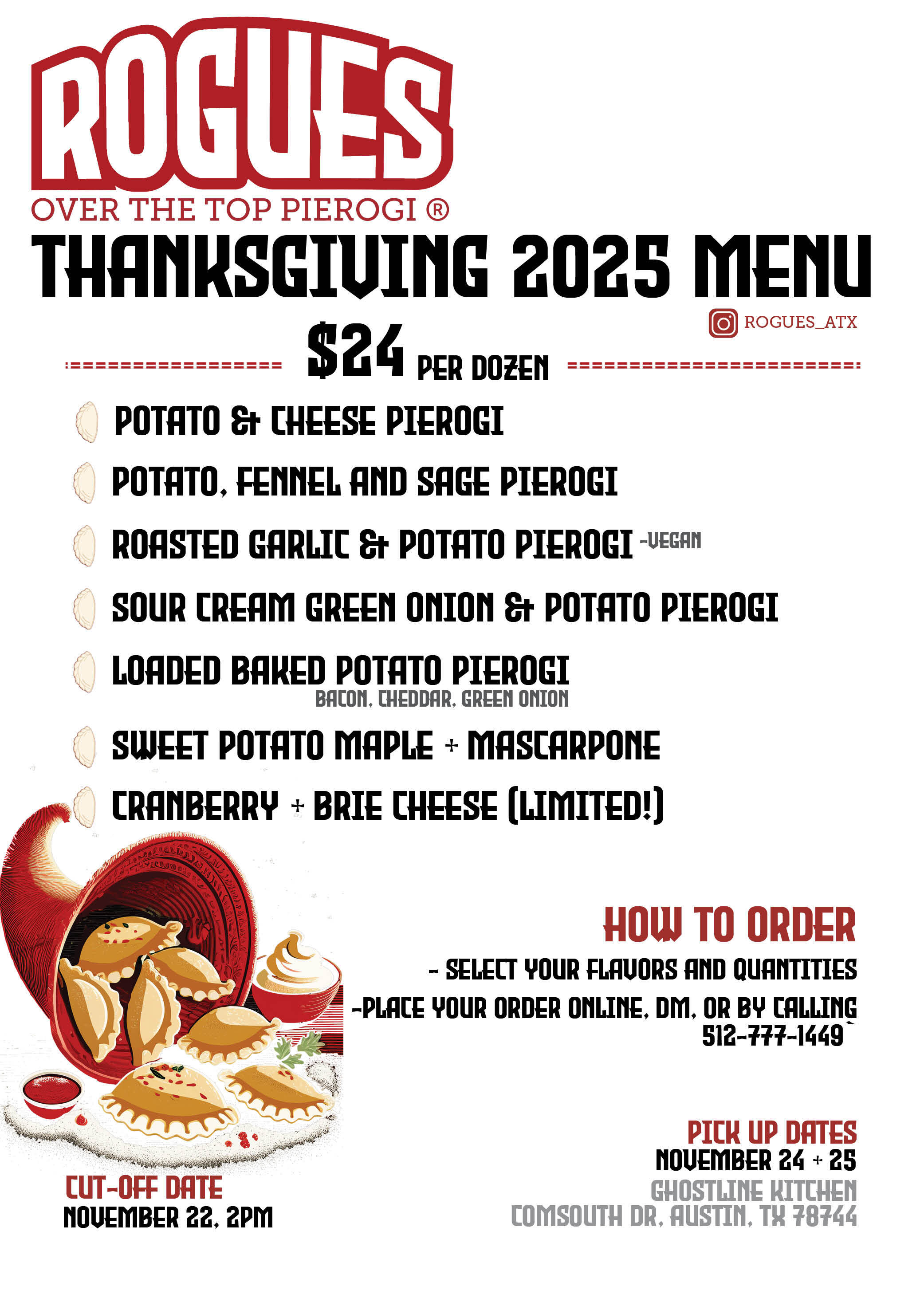 Hi! I’m Derek, chef and founder of Rogues Over the Top Pierogi. I like to cook, I love to eat, and I especially enjoy sharing my food and experience with others. I hail from the midwest, where corn and mayonnaise are mainstays in most meals, white bread & tomato sandwiches are a summer staple, and pierogi reign supreme. I received my formal culinary education at the Le Cordon Bleu Institute of Culinary Arts in Pittsburgh, PA. This is where I truly unlocked my passion for all-things culinary, as well as the power of the pierogi. I began making pierogi in my small studio apartment on days off and after school. I enjoying in the experimentation of different fillings and doughs, while still maintaining the authenticity and heritage of these potato filled delights. Upon graduating from LCB PA, I received my culinary masters at The Greenbrier Resort in West Virginia. Shortly thereafter, I found myself in the Lone Star State Capital, working as the Banquet Chef at he W Austin Hotel and then Executive Chef at the AT&T Center on the UT Campus. After a succesful re-opening of my property during the Covid 19 pandemic, I decided it was finaly time to pursue my dream of one day running my own company, where I could share my love of food, flavor, and pierogi with the public. Which brings us to here. Just three short years, one food truck, multiple farmers markets, and a dozen retail locations later, I can’t wait to share unique pierogi vision and experience with you.