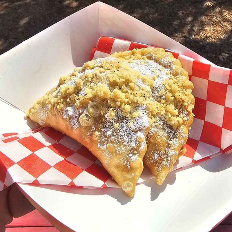 Large format, hand-held pierogi filled with blueberry compote and lemon curd