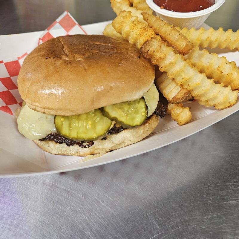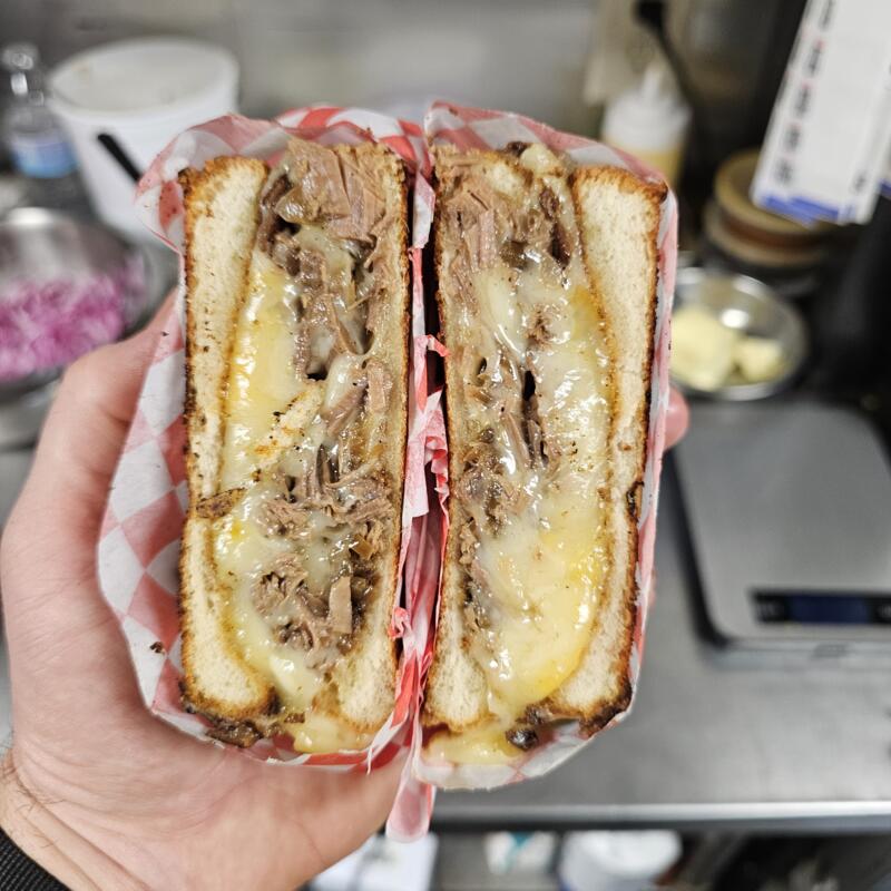 Tender, smoked brisket layered with melted cheese, served between slices of perfectly toasted bread.