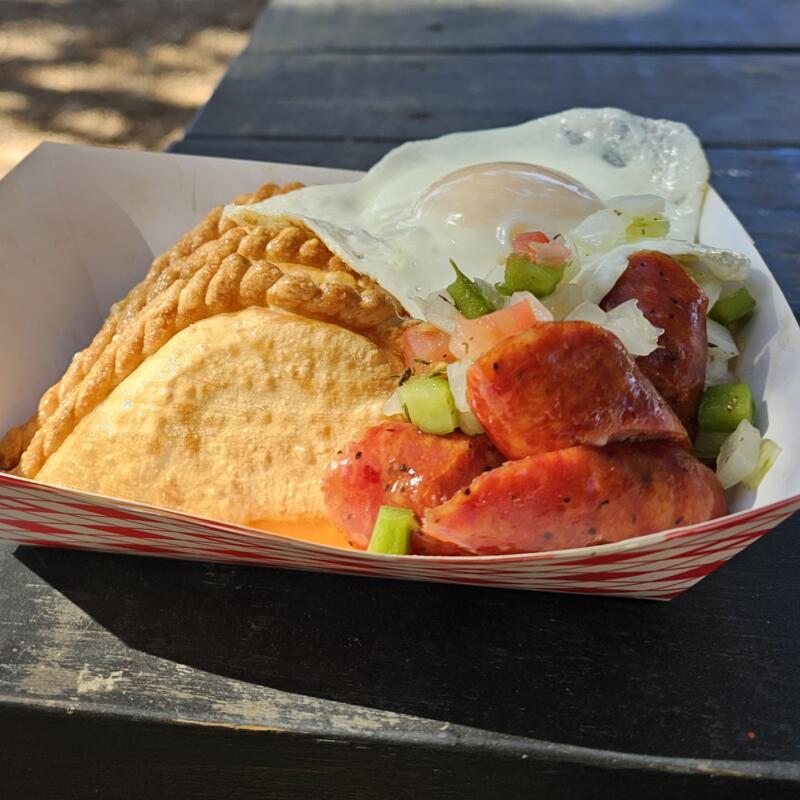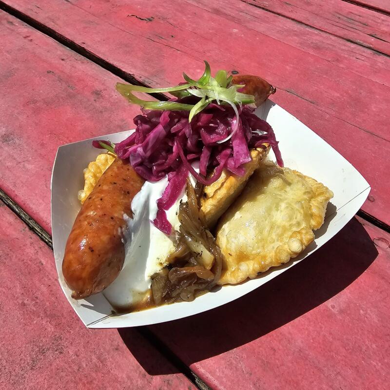 Featuring two potato cheese pierogi paired with a smoked quarter-pound kielbasa sausage, topped with a zesty tomato bell pepper sauce and a tangy Pittsburgh pico relish, crowned with a sunny-side-up egg.