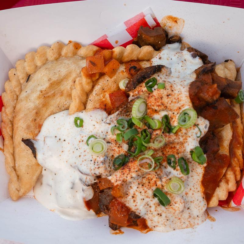 Large format hand-held pierogi filled with smoked mushrooms and sauteed veggies. Served with tomato bell pepper sauce on the side (VG)