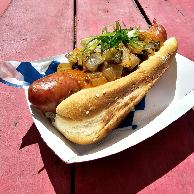4oz Hudson Meat smoked kielbasa, served on a toasted bolillo roll with house tomato bell pepper sauce and topped with pickled vegetable medley